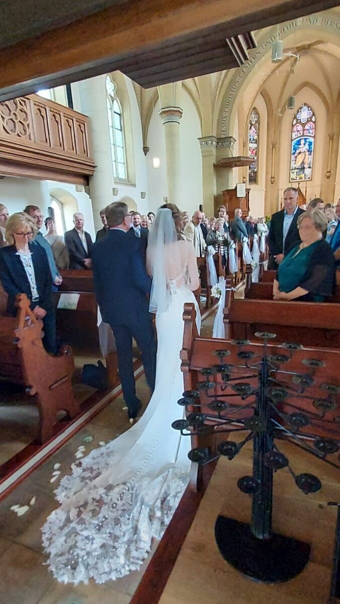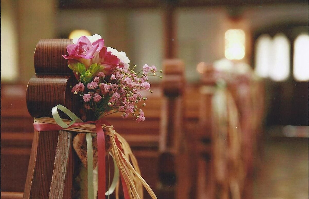 Der Mittelgang eignet sich gut für feierliche Ein- und Auszüge vorbei an 20 Bankreihen. In unsrer KIrche ist das Streuen von Blumen erlaubt, es gibt mit dunkelrotem Samt bezogende Stühle für das Brautpaar und maximal 4 Trauzeugen. Eine Kniebank steht zur Verfügung. Wir stellen eine Lautsprecheranlage und die gut gewartete Orgel kann genutzt werden. Selbstverständlich gibt es eine Gelegenheit sich die Hände zu waschen und mal in einen Spiegel zu schauen. Wir freuen uns auf besondere Momente mit Ihnen. Rufen Sie uns an.